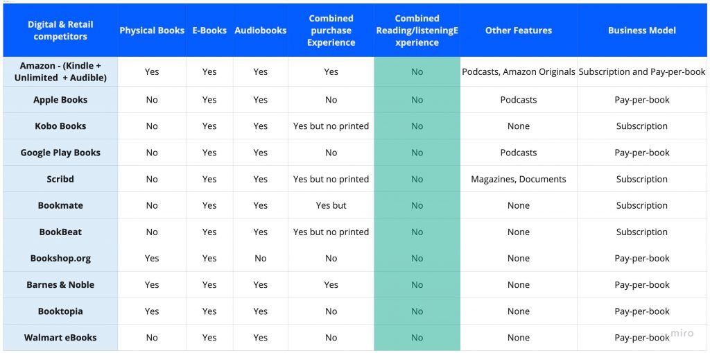 No one offers a combined reading/listening and note-taking experience of all the 3 formats (Book, Ebook & Audiobook). Hence, here we already see an opportunity.