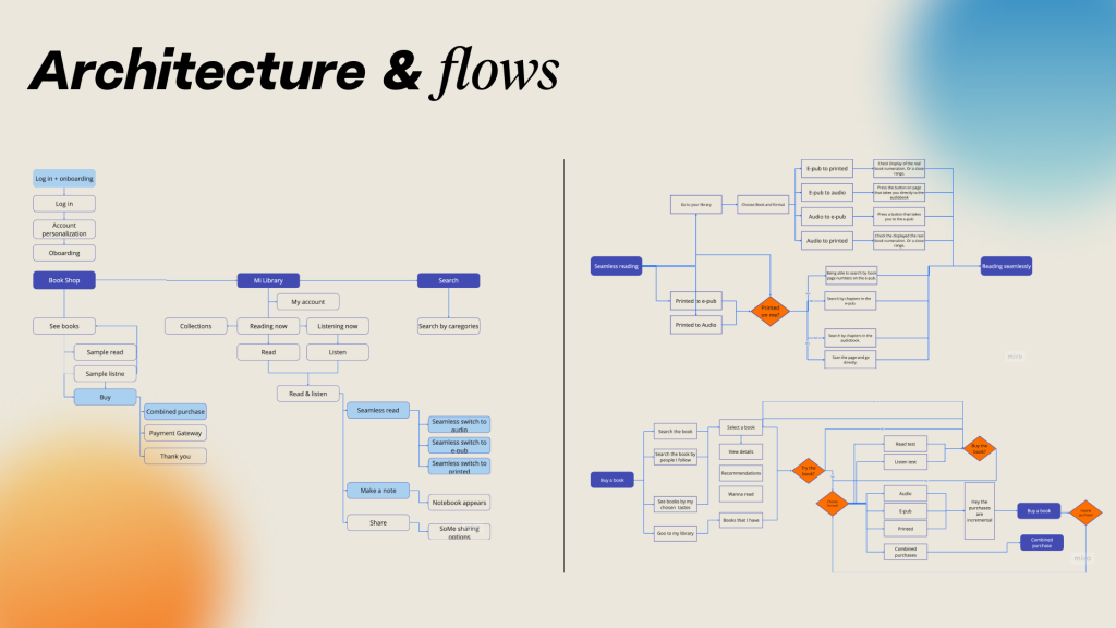 To begin this phase, I analysed the architectures of Audible, iBooks and Script. Then All the flows of the app were developed. Nonetheless, find below the ones focusing on providing a combined purchase experience and a seamless reading experience across all three book formats, Printed, Ebook, and Audiobook.